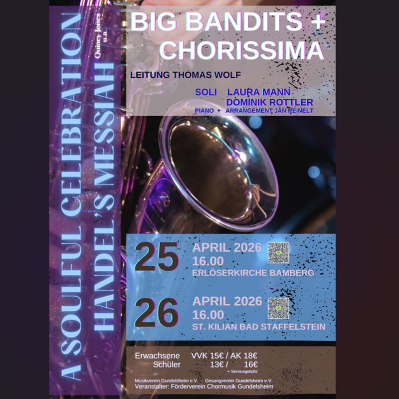 Chorissima (GV Gundelsheim) und die Big Bandits (MV Gundelsheim ) veranstalten unter Leitung von Thomas Wolf „A soulful celebration - Handel‘s Messiah“. Das Arrangement geht auf Quincy Jones zurück, der das berühmte Oratorium „Messias“ von Händel in afroamerikanischen Musikstilen neu interpretierte.