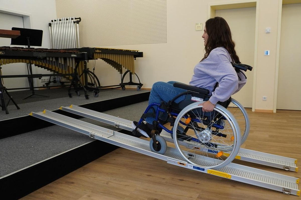 Der NBMB hat eine transportable Rollstuhlrampe (Schwellenrampe) angeschafft, um unseren Rollstuhlfahrer:innen den Zugang auf Bühnen zu erleichtern. Die tragbare Aluminium-Rampe wird unseren Mitgliedsvereinen für Konzerte oder Musikfeste selbstverständlich kostenlos zur Verfügung gestellt und kann über die Geschäftsstelle ausgeliehen werden.