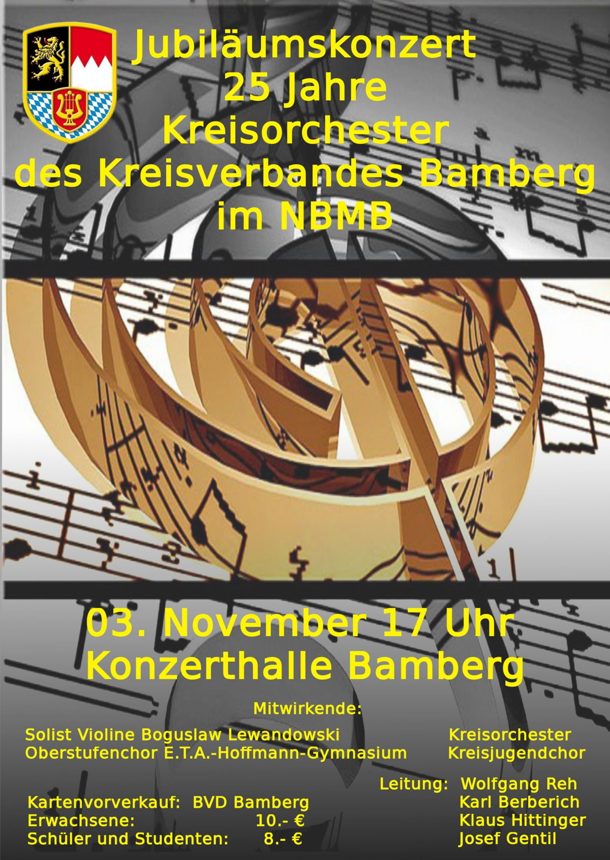 03. November – Konzerthalle Bamberg 25 Jahre Kreisorchester Bamberg Jubiläumskonzert mit Deutscher Erstaufführung der „Trois Evocations“ von André Waignein Mitwirkende: Kreisjugendchor, Oberstufenchor E.T.A.-Hoffmann-Gymnasium, Boguslaw Lewandowski – Geige |