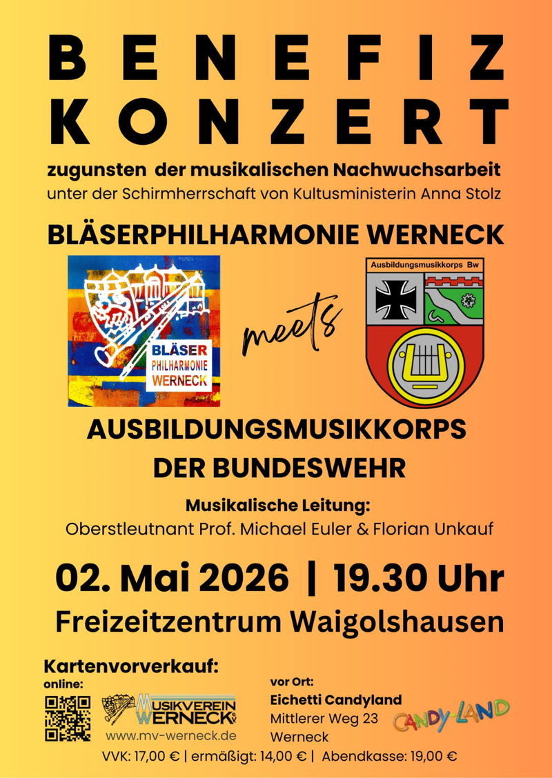 Karten für dieses eindrucksvolle Benefizkonzert unter der Schirmherrschaft von Kultusministerin Anna Stolz erhalten Sie ab sofort im Fabrikverkauf des Eichetti-Candyland oder online unter www.mv-werneck.de. Der Erlös kommt der Nachwuchsarbeit des Musikvereins Werneck sowie dem WIM-Projekt im Markt Werneck zugute.